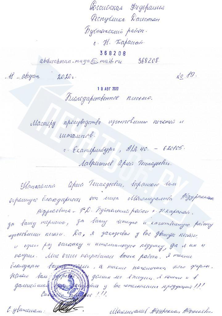 Уважаемый Сергей Геннадьевич, выражаю вам огромную благодарность от лица Магомедалиева Абдурахмана Абдулаевича - Р.Д. Буйнакский район с. Н.Каранай. за вашу терпение, за вашу четкую и качественную работу изготовлении печати. Да, я заказывал у вас дважды печати. и один раз оснастку и штемпельную подушку, да я их и получил. Мне очень понравилась ваша работа. Я также благодарю ваших коллег, а также начальника этого фирмы. Желаю вам здоровья, и долгих лет в жизни. Я конечно и в дальнейшем буду заказывать у вас штемпельных продукций!!! Спасибо огромное!!!